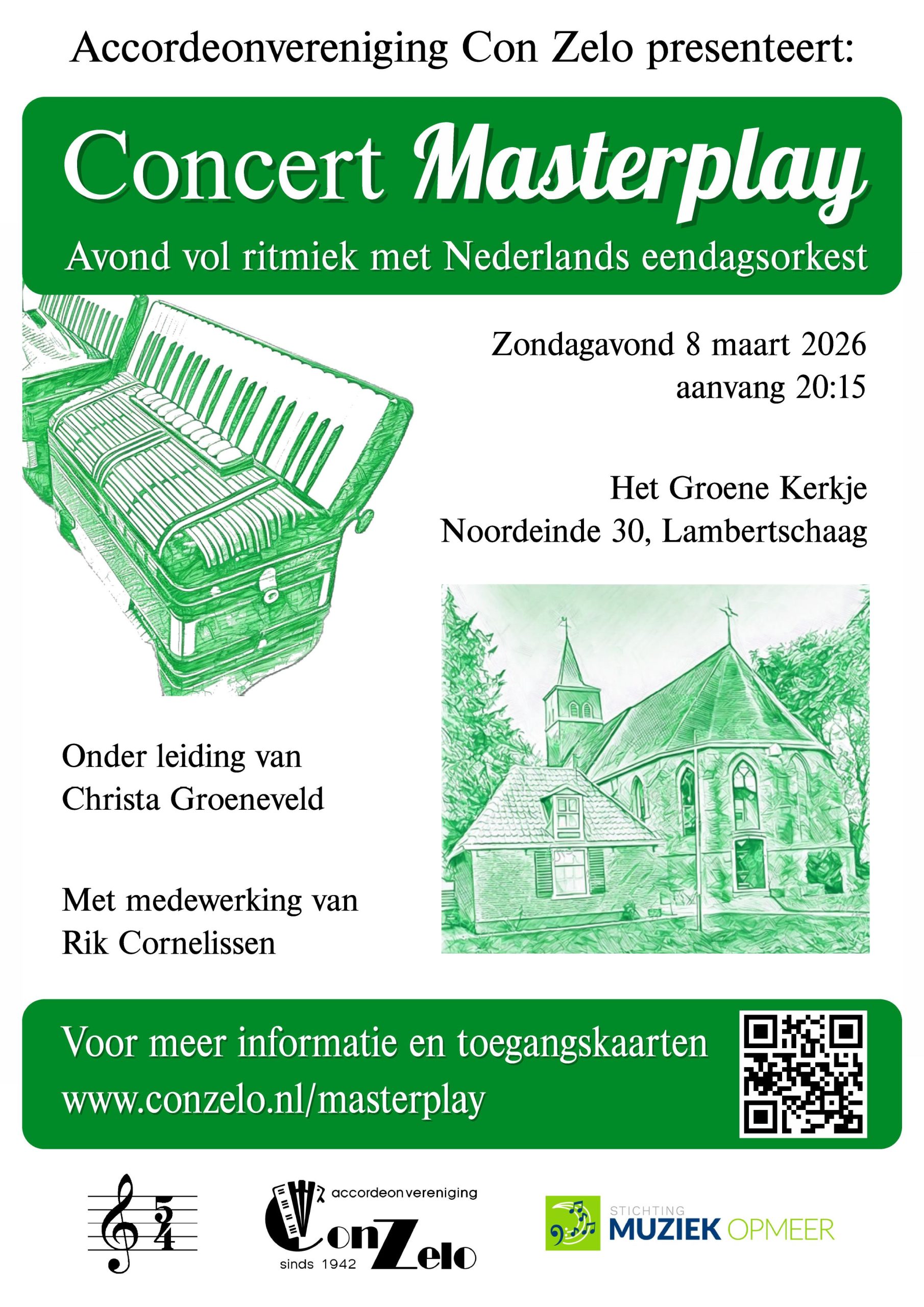 Is het een projectorkest voor één dag? Is het een play-in? Het is Masterplay, een uitdaging voor wie wat in zijn mars heeft en op niveau samen wil musiceren. Gedurende één dag werk je in vier repetities toe naar het afsluitende concert in samenwerking met jazzmuzikant Rik Cornelissen. Deze muzikale beleving wordt georganiseerd door kwintet Vijfkwarts van accordeonvereniging Con Zelo uit Hoogwoud.