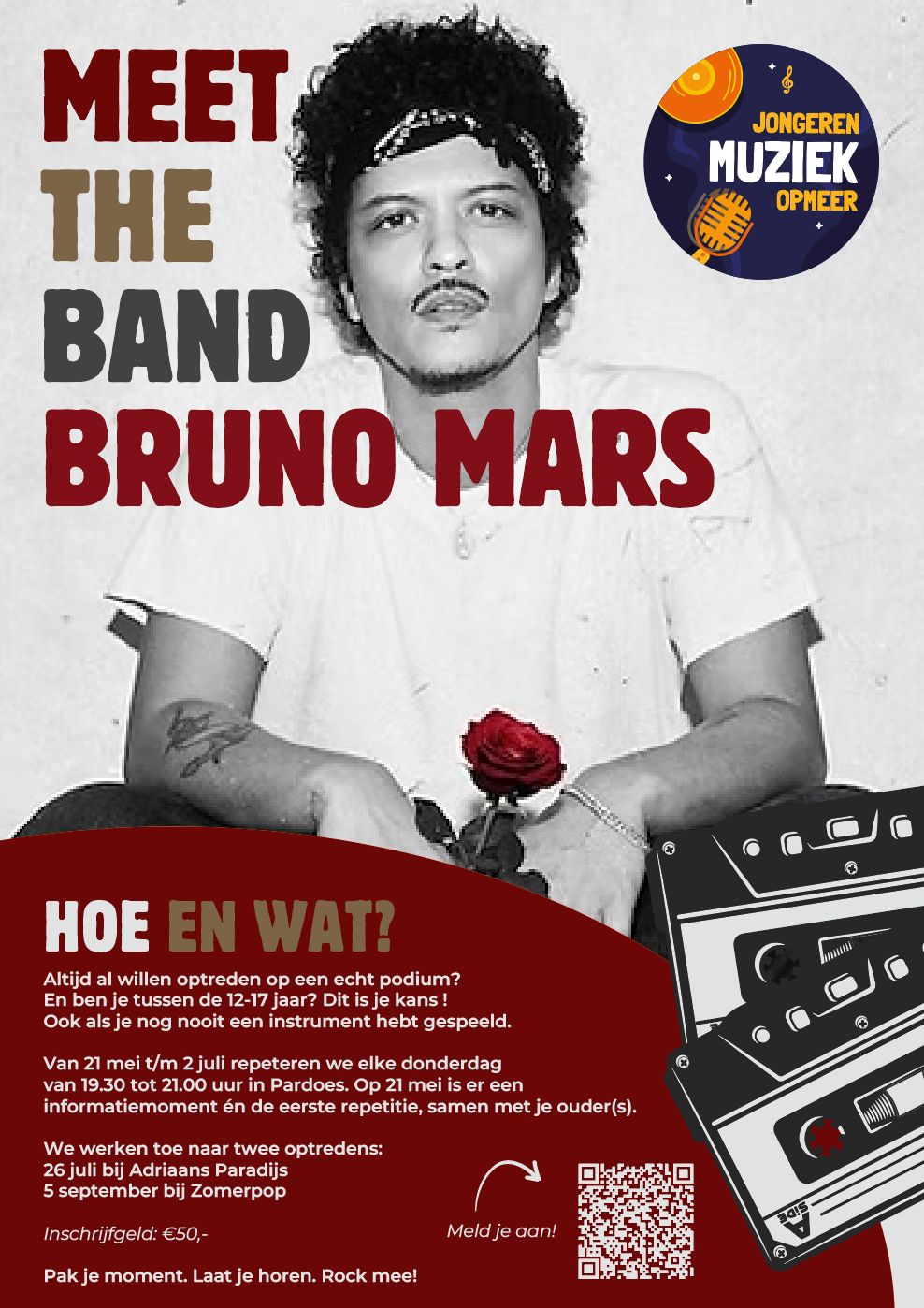 Meet the Band is een bandjesproject voor jongeren tussen 12 en 17 jaar (maar we kijken niet op een jaartje). In 8 workshops worden jongeren door de Rock ’n Rollfabriek gecoacht in het samenspelen van nummers van Bruno Mars. Muzikale ervaring is niet perse noodzakelijk, de coaching is maatwerk en wordt aangepast aan het niveau van de deelnemers.