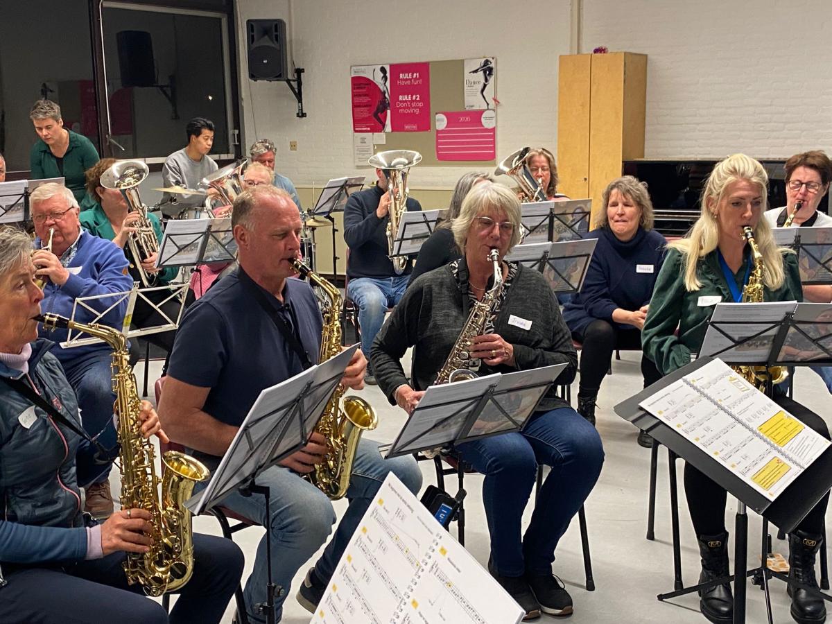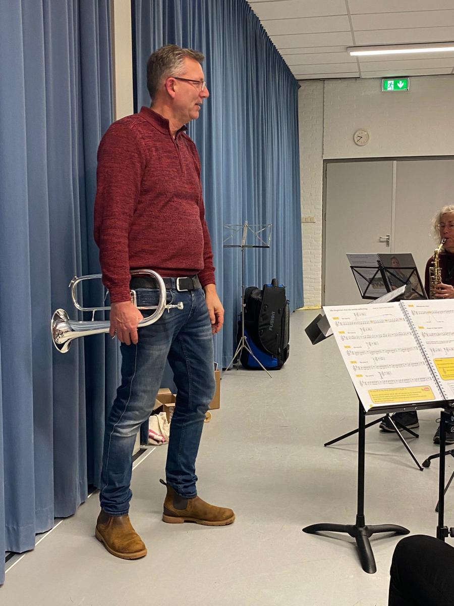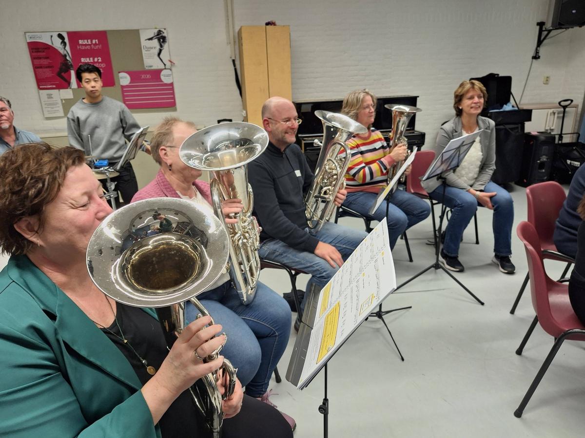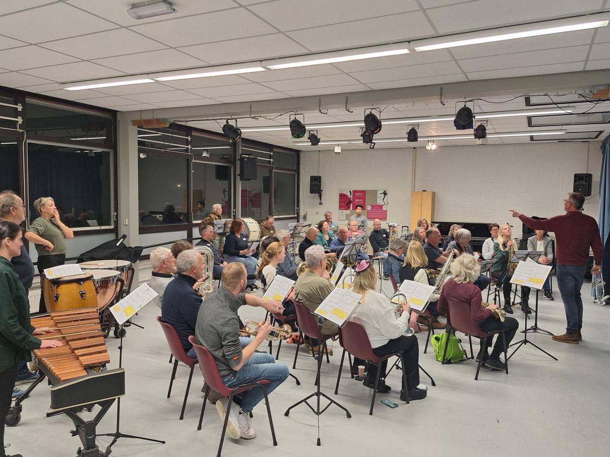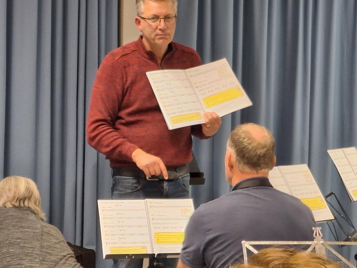 Na een half uur eerste groepsrepetitie met na de pauze instructie in het uitvouwen van de muziekstandaard. En aan het eind van de repetitie: 5 noten spelen op aanwijzingen van de dirigent.