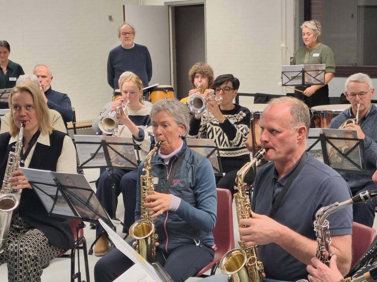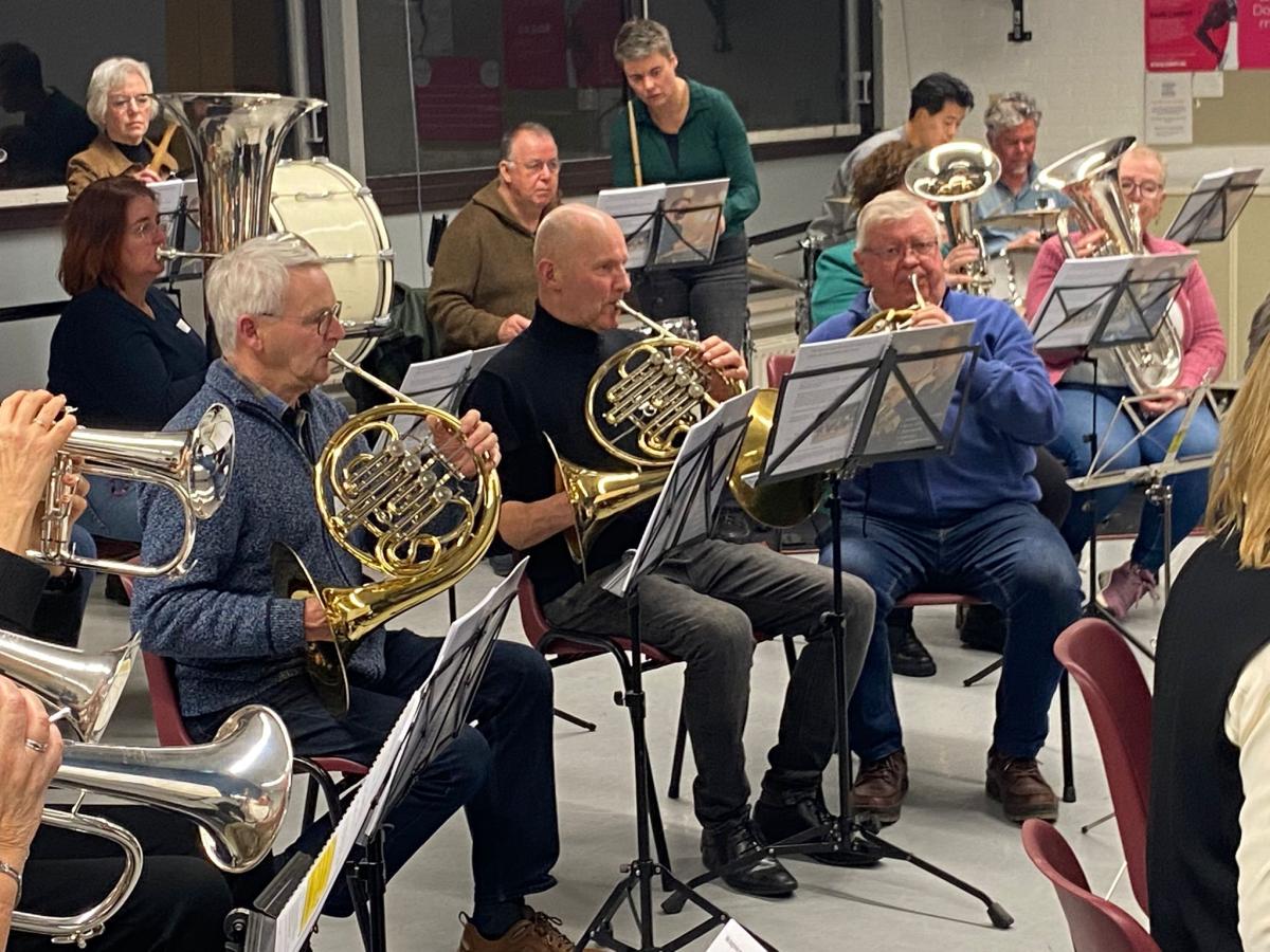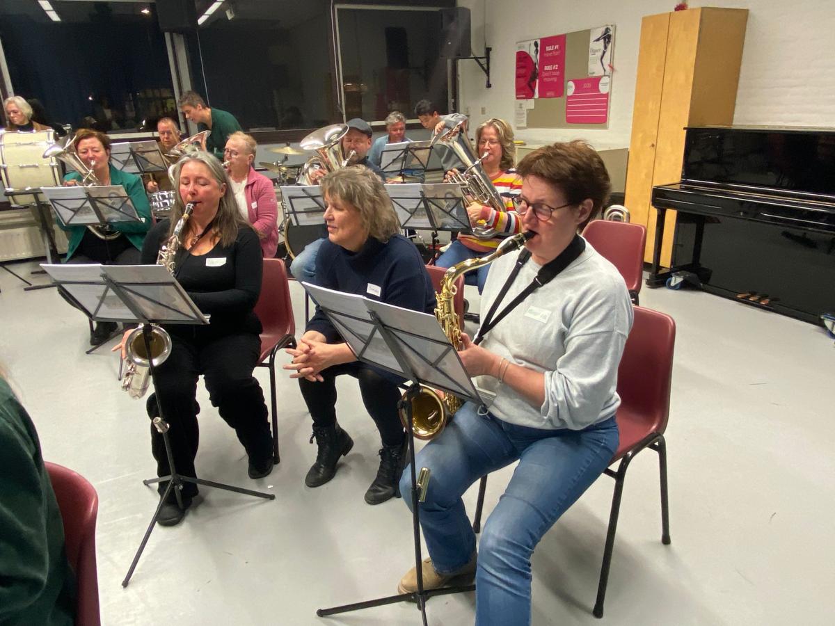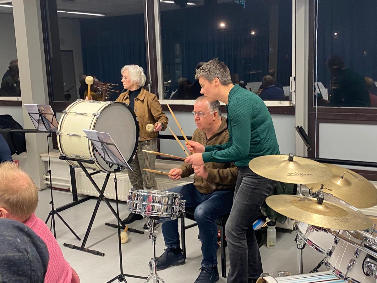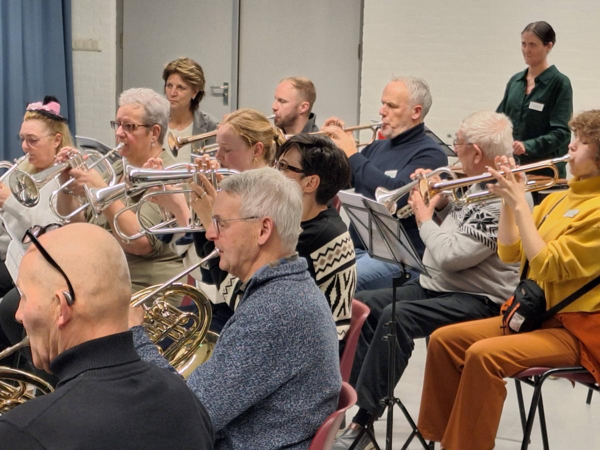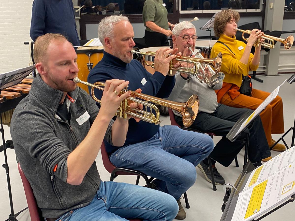 Na een half uur eerste groepsrepetitie met na de pauze instructie in het uitvouwen van de muziekstandaard. En aan het eind van de repetitie: 5 noten spelen op aanwijzingen van de dirigent.