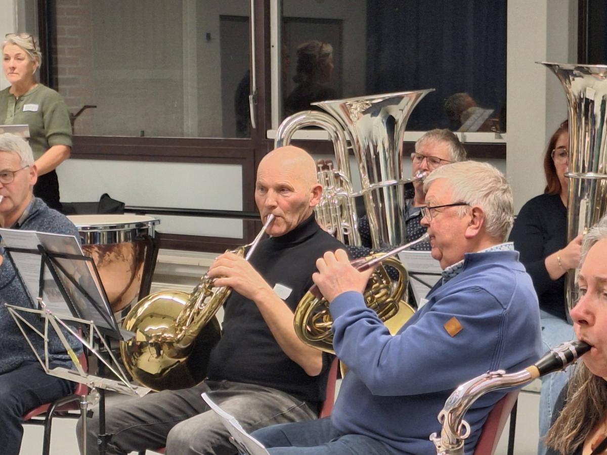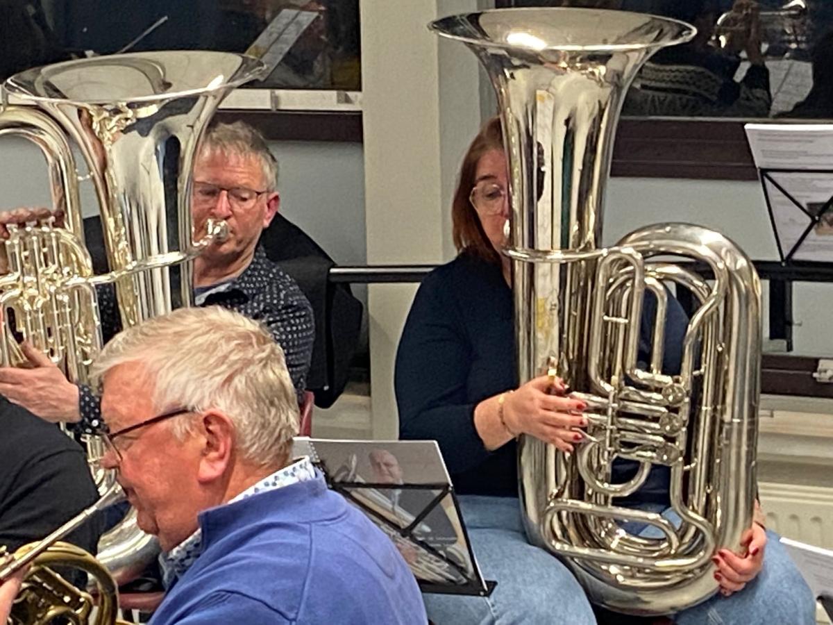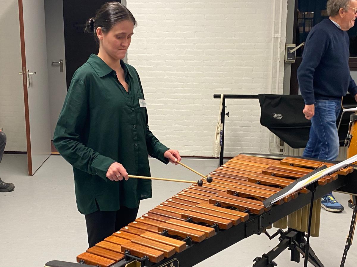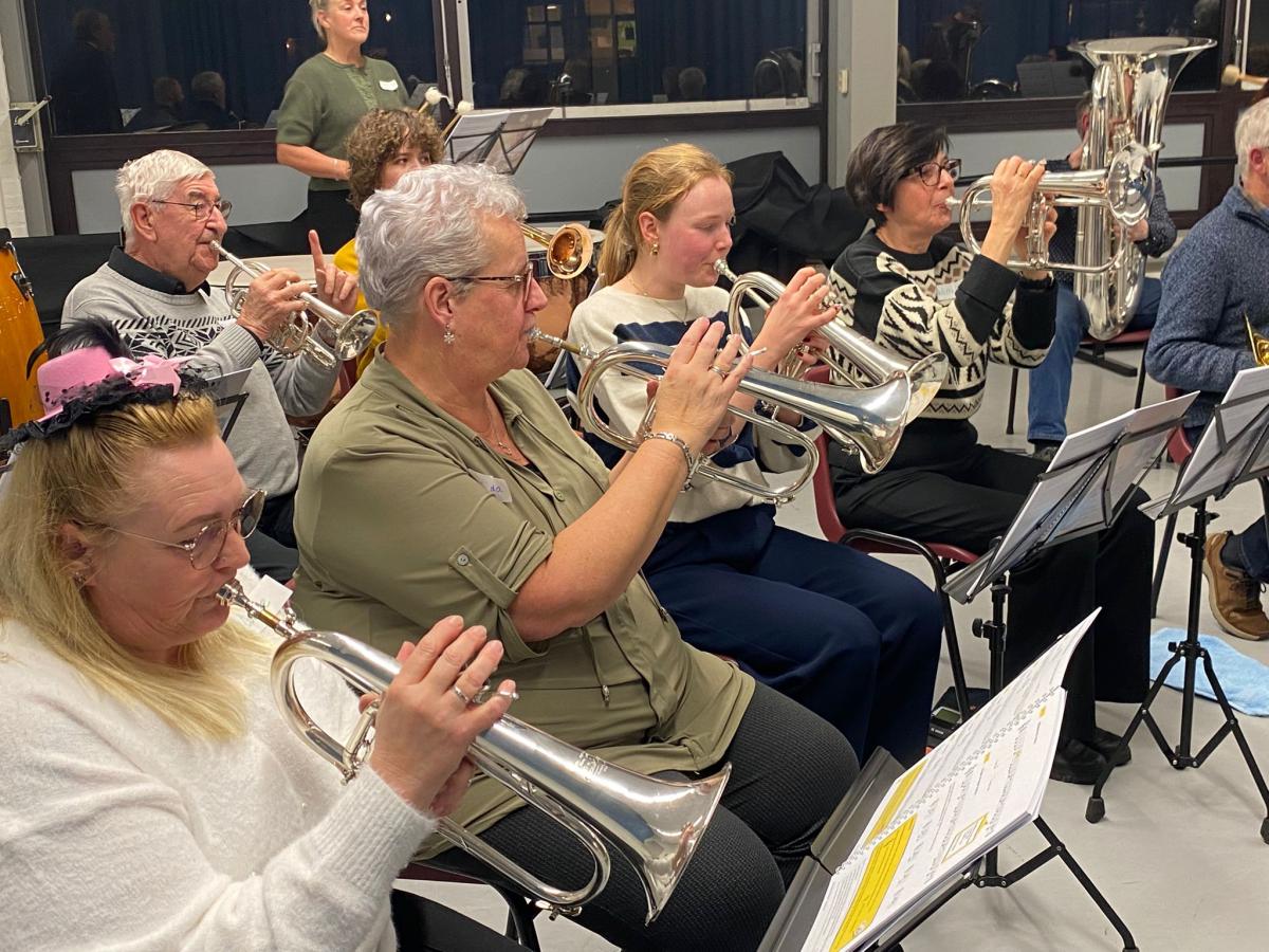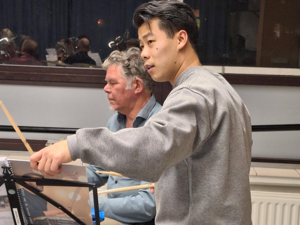 Na een half uur eerste groepsrepetitie met na de pauze instructie in het uitvouwen van de muziekstandaard. En aan het eind van de repetitie: 5 noten spelen op aanwijzingen van de dirigent.